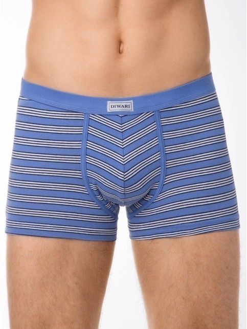 Bokserki męskie wykonane z dzianiny w paski. Klin z solidnym brzegiem z przodu bokserek. Pas wykończony elastyczną gumką, obszyty szerokim monochromatycznym materiałem.